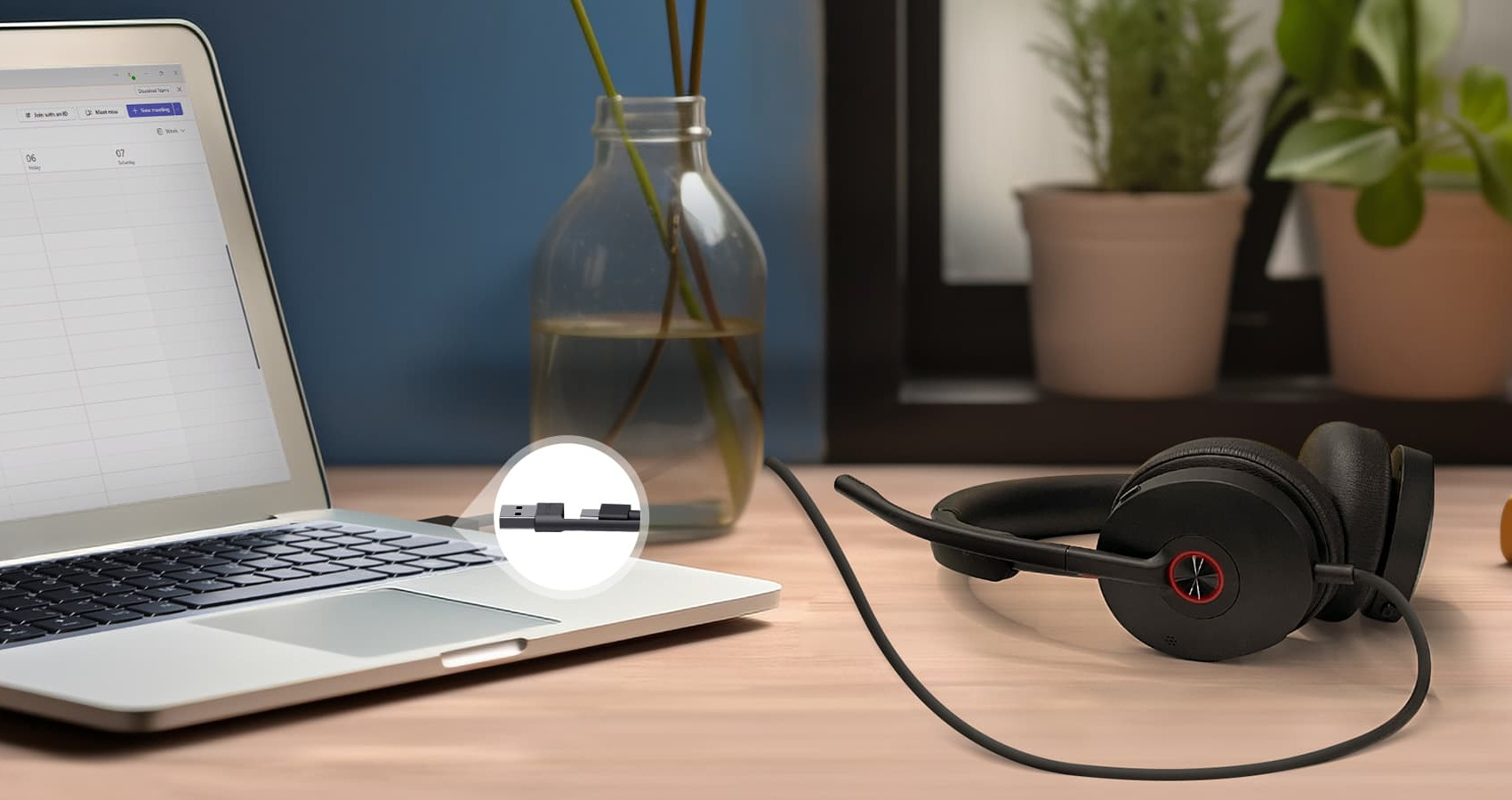 Stačí použít kabel USB-C s adaptérem USB-A pro flexibilní připojení typu plug-and-play k vašim zařízením. Zahajte své schůzky včas a užijte si plynulou komunikaci.