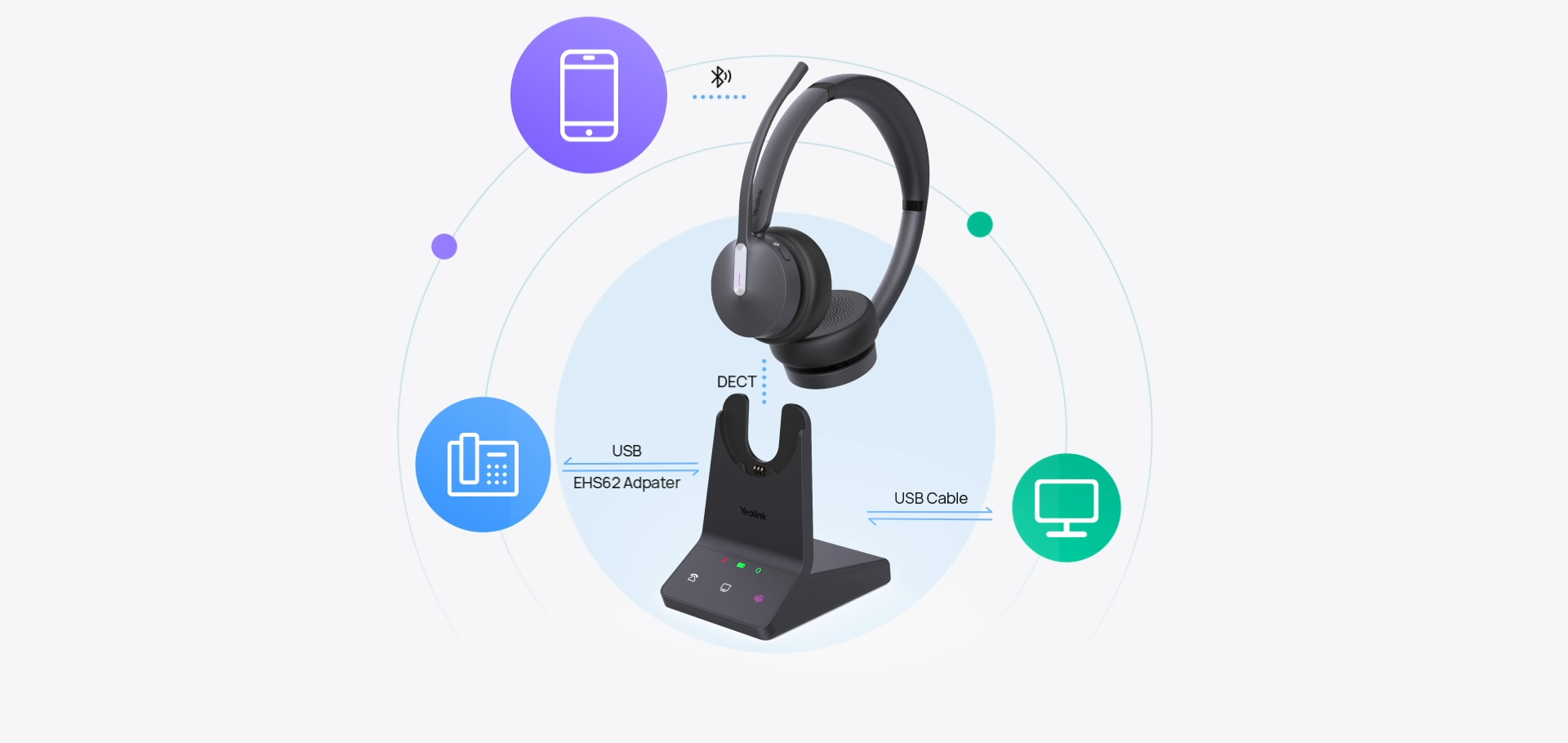 Náhlavní souprava Yealink WH64 integruje režimy signálu DECT i Bluetooth, což umožňuje flexibilní přepínání signálu bez základny. Ať už jste v rušné kanceláři nebo pracujete na dálku, tato náhlavní souprava zajistí jasné a profesionální konverzace.